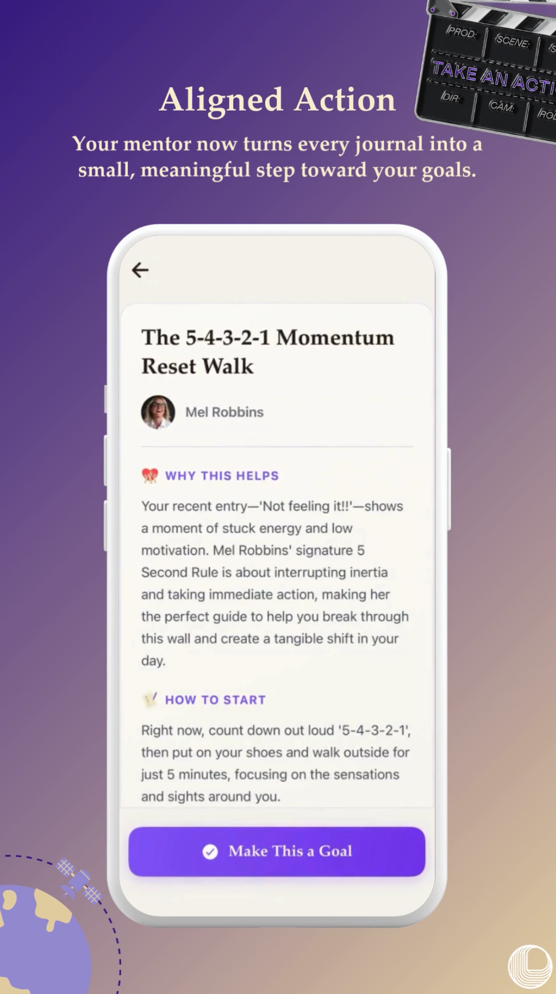 Now, after every journal entry, your mentor will suggest two small but meaningful actions — based on your life goal, yearly focus, and recent reflections.